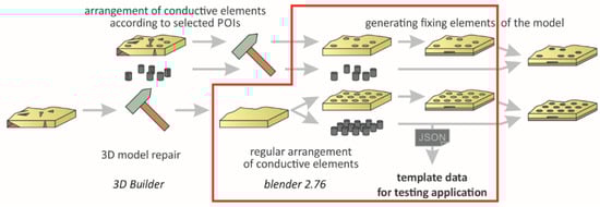 The Public Transport map type was generally the simplest one, merging buildings with other open spaces without streets or paths. On the other hand, the Tourism map was expected to be the most complex and the most difficult to read, having five height layers instead of four (Table 1). This map was intended for experienced tactile map readers. All the maps were prepared uniformly in 1:4000 scale. The 3D modeling block (Figure 10) begins with automatic repair of potential geometry errors in STL files. In this step, realized in the 3D Builder [] freeware software. This process is very straight-forward and involves only to agree with the repair. Then, all non-interactive layers were merged, resulting in two 3D models instead of four to five separate models. One model represented the topographic base layers for non-conductive material, while the other represented the thematic layer of interactive POIs prepared for conductive material. Union Boolean operation was applied in the process of merging.