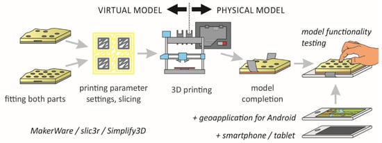 In the last part of the workflow (Figure 11), Slic3r [] software was chosen to set printing parameters of both models to be printed using a Poseidon Duo 3D printer equipped with 0.4 mm nozzles. Precise calibration of the nozzles’ height above the printing bed had to be done before launching the 3D printing process as it may influence the quality of the outcomes []. Otherwise, model parts printed by one nozzle could have been damaged by the second nozzle, and the adhesion of the model could be insufficient. Proto-pasta PLA filament was used for printing the conductive map elements, while blue non-conductive PLA was used for 3D printing of the non-interactive part of each tactile map. A layer height of 0.2 mm was used to reduce printing time because no continuous changes of the surface were present in case of the tactile maps. Using lower layer height would not, therefore, result in smoother surface. Infill of 60% was applied to keep especially the conductive parts durable enough. A temperature of 215 °C was set for both extruders and 50 °C for the printing bed. This, however, differs a lot according to the 3D printer and filament used. Therefore, no strict recommendations related to the printing temperature could be given. The printing time varied between two and three hours.
