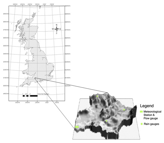 The Brue catchment (total area 135.5 km2) located in the south-west of England is chosen as the study area (Figure 1). The lowland wet grassland of the catchment forms part of the unique landscape of the Somerset Levels and Moors and the region is internationally and nationally designated for its conservation and landscape value. The other minor cover types found in the catchment are forest and urban areas. The area is characterized by a non-complex topography area for the most part, with most of the catchment area covered by agricultural land (95.22%), with a small number of forest patches (3.12%) and urban areas (1.66%). In the Brue catchment, the distribution of soil indicates that most of the area is composed of a clayey type (49%) of soil followed by coarse loam (29%) and silt (21%). The selected study area has been used previously in many studies and equipped with maintained meteorological and flow station by British Atmospheric Data Centre and Environment Agency, respectively [34,35,36,37]. The whole terrain comes under topography, with no steep slopes and with an average altitude of 105 m AMSL.