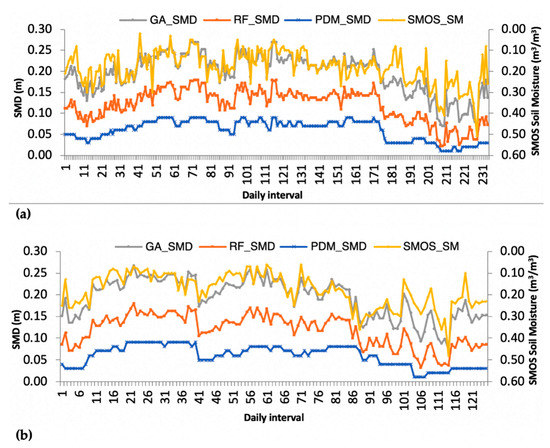 Temporal trend in SMOS soil moisture and SMD from different approaches (a) calibration and (b) validation.