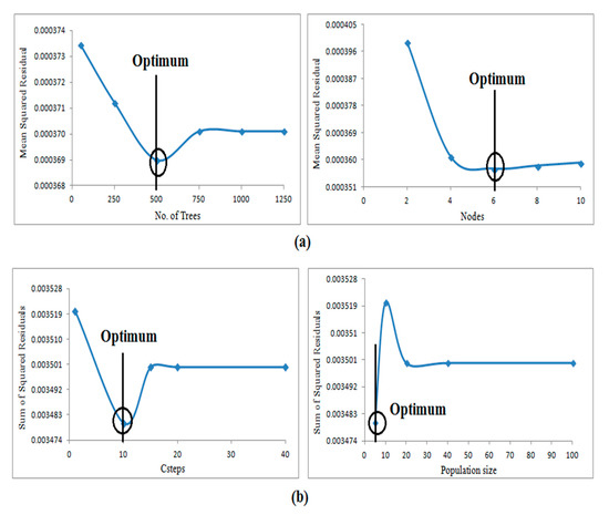 For reliable results, the RFs and GALTS techniques must be optimized, which necessitates a preliminary review of parameters before using them for the final prediction (Figure 3). For RFs, initially, we started with a very small number of trees (around 50) and measured the performance of the technique with respect to the measured SMD. This process was repeated up to a total of 1250 number of forest trees. The mean squared sum of residual is used as an objective function for optimizing the number of trees. For any artificial intelligence technique, this form of trial-and-error approach is widely used to select the right parameters [42]. A similar approach is used for optimizing the number of nodes in RFs. After all the analysis, the optimum values of parameters are obtained as 500 with respect to number of trees and 6 for the number of nodes in the RFs algorithm.