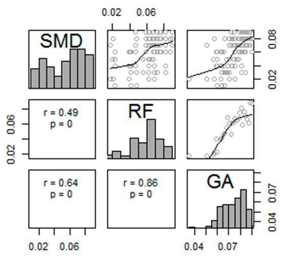 Correlation matrix plot between RFs, GALTS and PDM SMD during validation (the black line indicates the fitting line and the histogram shows the variation of the particular parameter).