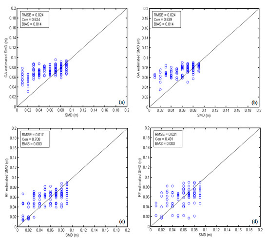 For SMD prediction using the SMOS soil moisture, RFs and GALTS methods are used, while scatter plots depicting the output of various approaches in terms of correlations are given in Figure 4. For developing an appropriate algorithm, the calibration and validation datasets are split into two groups first. Two-thirds of the data from each month is used for calibration, while the other third is used for validation, ensuring that all calibration and validation data are indicative of both seasons. After deriving the relationships, the validation results are used to test the algorithms. The notable things observed in the validation correlation plot are some lower correlations of RFs-simulated SMD, while the correlation of GA-simulated SMD indicate a higher value with the PDM SMD. The best correlation statistics are obtained GALTS with a value of 0.64, followed by a value of 0.49 with RFs-estimated SMD.
