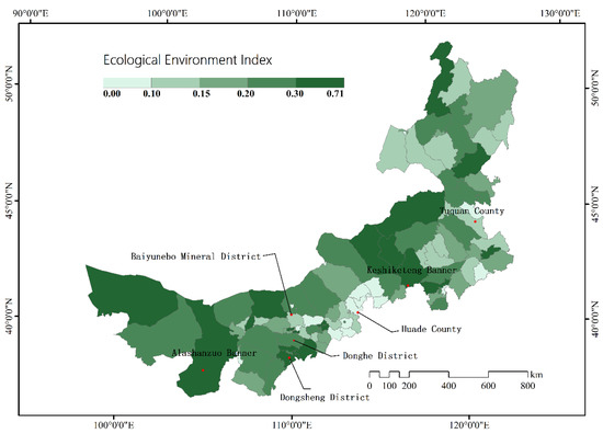 A total of 37,963 POIs were related to the ecological environment in the IMAR. Among them, 836 were park squares, 1276 were scenic spots, 33,659 were natural landscapes, 1502 were leisure places, and 690 were vacation and recuperation places. On average, there were 368 ecological environment-related POIs in each banner (county and district). The maximum ecological environment index value in the whole region was 0.71, the mean was 0.21, and the standard deviation (SD) was 0.13. The coefficient of variation (CV) is a dimensionless quantity for comparing the degree of variation from one data series to another, even if the means are drastically different from one another. The larger the CV, the larger the degree of variation (deviation). Here, the CV of the ecological environment was 62% (CV = (SD/Mean) × 100%). A total of 21 banners (counties and districts) in the region had an ecological environment index value higher than 0.3. Among them, Alashanzuo Banner in Alashan League, Keshiketeng Banner in Chifeng City, Qingshan District in Baotou City, Dongsheng District in Erdos City, and Donghe District in Baotou City had the highest ecological environment index values, all above 0.5. Baiyunebo Mineral District in Baotou City, Huade County in Wulanchabu City, and Tuquan County in Xingan League had the lowest ecological environment index values, all lower than 0.05 (see the red dots in Figure 1). The reasons for these findings are as follows: As a traditional industrial and mining area, the number of natural landscapes, scenic spots, park squares, and vacation and recuperation places in the Baiyunebo Mineral District was low. As a traditional agricultural county with an underdeveloped economy, Huade County lacked natural landscapes, holiday resorts, and park squares. Tuquan County lacks scenic spots, park squares, and leisure places.
