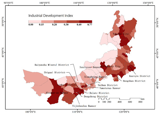 Spatial distribution of the industrial development index in Inner Mongolia in 2020.