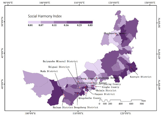 A total of 49,602 POIs were related to social development and living convenience. Among them, 10,761 were public facilities, 16,814 were healthcare services, 4882 were shopping malls and supermarkets, 8321 were convenience stores, and 8824 were transportation hub facilities. On average, each banner (county or district) had 481 POIs related to social development and living convenience. The maximum social harmony index of the whole region was 0.85, the mean was 0.19, the SD was 0.17, and the CV was 89%. The social harmony index values of 21 banners (counties and districts) in the region were higher than 0.25. Among them, Huimin District in Hohhot City, Jining District in Wulanchabu City, Keerqin District in Tongliao City, Yuquan District in Hohhot City, and Dongsheng District in Erdos City had the highest social harmony index values, all above 0.5. Shiguai District in Baotou City, Wuda District in Wuhai City, Xianghuang Banner in Xilinguole League, Chahaeryouyihou Banner in Wulanchabu City, Chenbaerhu Banner in Hulunbeier City, Baiyunebo Mineral District in Baotou City, Hainan District in Wuhai City, Xinghe County in Wulanchabu City, Siziwang Banner in Wulanchabu City, and Qingshuihe County in Hohhot City 10 banners (counties, districts) had the lowest values, all less than 0.05 (see the red dots in Figure 3). The reasons for these findings are as follows: Shiguai District and Wuda District lacked convenience stores, healthcare services, large shopping malls, and supermarkets. Xianghuang Banner lacked transportation hub facilities, public facilities, and healthcare service points; Chahaeryouyihou Banner and Chenbaerhu Banner lacked transportation hub stations, large shopping malls, and supermarkets. Baiyunebo Mineral District lacked transportation hub facilities, public facilities, and healthcare service points. Hainan District mainly lacked large shopping malls and supermarkets. Xinghe County, Siziwang Banner, and Qingshuihe County mainly lacked transportation hub facilities.