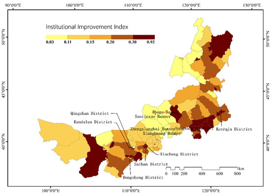Spatial distribution of the institutional improvement index in Inner Mongolia in 2020.