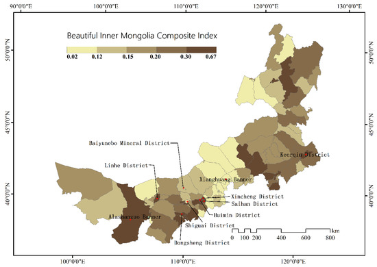 Spatial distribution of the composite Beautiful Inner Mongolia index in 2020.