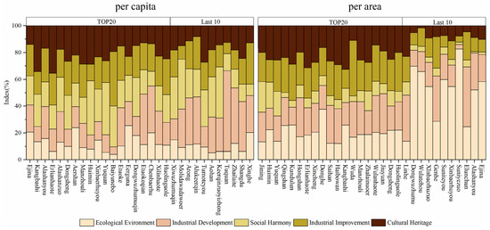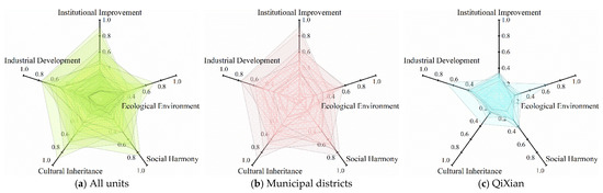 Using the radar chart, the evaluation results of the construction of a Beautiful Inner Mongolia in all 103 county-level administrative regions and five dimensions in the IMAR are displayed in Figure 7a. In terms of the scores of each dimension, the industrial development index of Inner Mongolia’s banners, counties, and districts was the highest (mean = 0.28), and the cultural heritage index was the lowest (mean = 0.18), revealing that the level of industrial development and the construction pressure in the field of the cultural heritage of all banners, counties, and districts in Inner Mongolia were relatively high. In terms of the degree of agglomeration of the scores of each dimension, the cultural heritage and social harmony indexes of each banner, county, and district were relatively scattered (the CVs were 94% and 89%, respectively), which showed that large regional differences existed in the different banners/counties, and districts in Inner Mongolia.