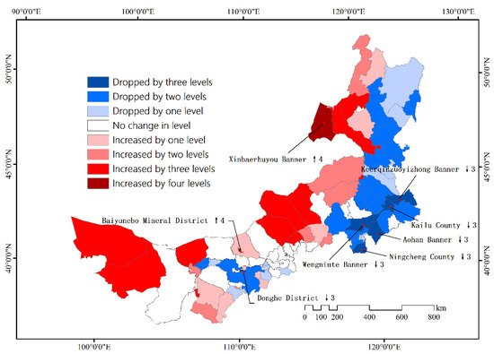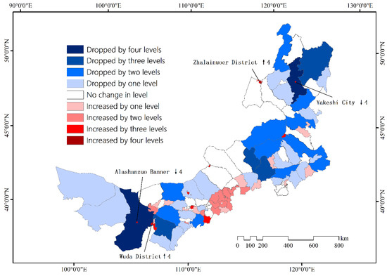 Comparing the evaluation results based on the total amount of POIs and the number of POIs per capita (Figure 9), we found that the rankings of the banners (counties, districts) in the eastern, southeastern, and central HuBaoE city circle of Inner Mongolia, which has a large population base, showed a downward trend. In the western and northern banners (counties, districts) of Inner Mongolia, which have a small population base, the ranking of the evaluation results showed an upward trend. Specifically, 25 banners (counties) showed a downward trend, including Baiyunebo Mineral District (Baotou), Xinbaerhuyou Banner, Hainan District, Huolinguole City, Zhalainuoer City, etc. The rankings of 25 counties in urban areas rose significantly (rankings increased by more than two levels). The rankings of 29 banners (counties), including Kailu County, Keerqinzuoyizhong Banner, Aohan Banner, Ningcheng County, and Wengniute Banner, dropped significantly (the rankings dropped by more than two levels). Further analysis showed that in these banners (counties, districts), due to the large population base, the construction of an ecological environment, industrial development, and other related fields could not effectively support Beautiful Area construction in the administrative region.