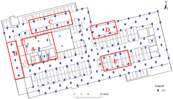 In an ideal experimental environment, when beacons were deployed in a regular structure and reasonable spacing, optimal results were usually achieved [19]. However, in real-world conditions, the physical environment is usually more complicated, which results in beacons not being deployed according to target rules and the disruption of signals. For these reasons, the signal composition for real-time positioning is extremely complicated. Figure 1 shows the actual deployment of BLE beacons in an underground parking lot. The deployment of beacons and the signal coverage in each region were different. Theoretically, the density and structure of Area-D are optimal, and the best positioning accuracy can be obtained. However, the deployments Area-A and -B are not suitable for the trilateration positioning algorithm. Modeling the algorithm to select the appropriate beacon and algorithm for positioning according to the beacons around the device greatly affects the positioning effect in practical applications.