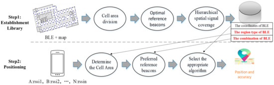 The framework of the proposed method is shown in Figure 2. The method consists of two parts: establishment library and positioning. In the establishment library phase, map information and BLE are used to divide the positioning area into multiple cell areas, and each area has a set of optimal reference beacons. Previously independent beacons will be optimally combined for positioning. In the positioning phase, the real-time beacon sequence is used to determine the cell area to which the device belongs. The optimal beacon combination is used to select reference beacons from real-time beacons to achieve accurate positioning. The procedure of the whole algorithm framework is described in Algorithm 1.