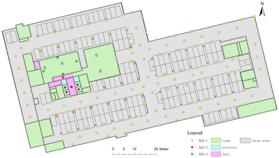 Map information is usually used to mark out the BLE settings location, or used to assist in constraining the positioning results [3,11,12,13]. However, the map information can also constrain the relationship between beacons and assist in the division of areas. When there is insufficient map information, the BLE beacon alone works in the area, and we cannot know the BLE deployment structure and density in different areas. When BLE is displayed on the map, the detailed information of BLE can be obtained from a global perspective, and its functions are mainly manifested in two aspects: