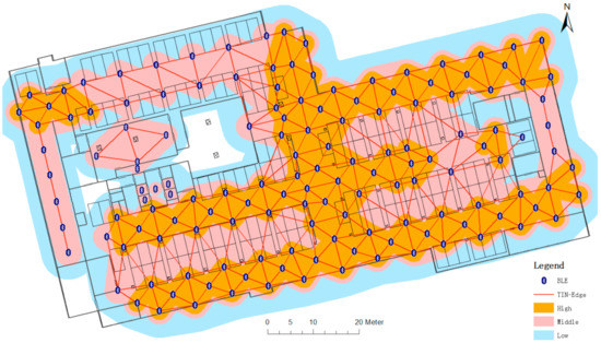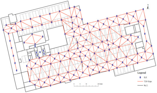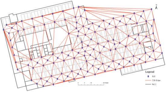 In indoor positioning, triangle-distributed beacons are often selected for positioning [22]. Based on the position of beacons, this study uses the triangulated irregular network (TIN) algorithm [38] to segregate beacons into spatially related triangles. The TIN algorithm prioritizes the characteristic of constructing an acute triangle, so that the closest beacons in space are connected, thereby achieving a more reasonable triangulation of the entire area. Figure 4 shows the result of the TIN algorithm; the two beacons are connected by a red line, which is called TIN-Edge in the present paper, indicating that there is an association between the two beacons. In particular, the TIN algorithm is only applicable when there are more than 3 beacons in the area. When the number of beacons is not more than 3, the connecting line between the beacons is TIN-Edge.