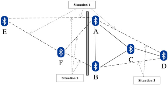 Situation 1: long distance. The RSSI and availability decreased as the distance increased. When a certain distance threshold is exceeded, the correlation between the two beacons is extremely weak. In this study, a threshold of 20 m was selected to eliminate excessively long connected edges.