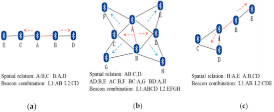 Based on the deployment of the beacon, the layout type of the reference beacon combination can be divided into four types: dots, lines, polygons, and mixed. In addition to the fact that the dot is an independent beacon node and has no correlation with other beacons, the spatial relations among the beacons differ based on layout types. Figure 7 shows the spatial relationship and optimal combination of the reference beacons of virtual area AB in different layouts. Figure 7a is a linear layout; its basic structure is line segments, and the spatial relationship is “A: B, C.” Figure 7b is a polygonal layout; the basic composition is triangles, and the spatial relationship is “AB: C, D.” Figure 7c presents a mixed layout where the basic structure includes triangles and line segments. The basic structure of the center of the area was used as the main body to construct the spatial relationship. In Figure 7c, AB is the line segment, and the spatial relationship is “A: B, C, D.” Using the spatial relationship between the beacons, the optimal reference beacon combination of the cell areas of different layouts can be obtained, and all the cell areas can be traversed to obtain the optimal reference combination. In addition, when a sub-optimal reference beacon in the cell area is required, the next-level associated beacon can also be determined based on the optimal reference beacon. L1 and L2 in each sub-picture in Figure 7 represent the optimal reference beacon combination and the suboptimal reference beacon combination of the cell area. When regional beacons are deployed linearly, the combination of L1 and L2 is used as the final reference beacon. When the beacon has a polygonal layout, L1 alone can meet the requirements of the reference beacon.