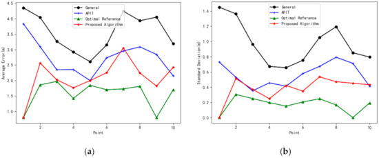 The distributions of the average error and standard deviation of the positions calculated using different methods at sampling points T1–T10 are shown in Figure 10. When the general method is used for direct positioning, the error, and standard deviation are large, and the fluctuation of the signal causes the overall positioning to be poor. The accuracy is relatively higher only in the center of the area (T3, T4, and T5). However, using the regional optimal reference beacon combination to select the beacon positioning provides the best positioning accuracy and stability, indicating the significance of accurately selecting the reference beacon for positioning accuracy. Compared with the APIT algorithm, our algorithm performs better and is closer to the optimal reference, especially when the nearest reference beacon layout does not meet the triangular structure, such as T0, T8, T9, etc. Furthermore, our algorithm considers the positioning value of the beacon while selecting the reference beacon. By determining the positioning value of the beacon sequence, our method can identify and eliminate the beacon sequence with large fluctuations, thereby ensuring positioning accuracy.