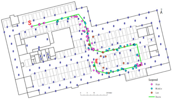 The tester holds the smartphone and travels from point S to point E according to the green route in Figure 11, and the positioning result output of our algorithm is also shown in the figure. The result is displayed in different colors according to the score of the location (high, medium, and low levels). Successful output result indicates that the beacon sequence meets the algorithm-filter conditions. Figure 11 shows that the high-level points are mostly located in the center of the cell area, which is consistent with the conclusion of Section 4.2; thus, the central area has better signal coverage. The middle-level points are primarily detected along the direction of travel and also have good performance. The low-level points deviate slightly from the route.