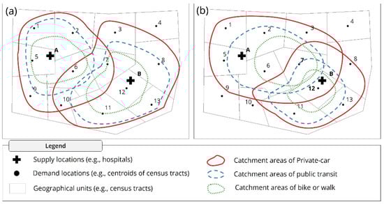 Conceptual diagram of the multimodal spatial accessibility: (a) the first step of the multimodal 2SFCA, calculating the supply-to-demand ratio of each supply facility to each transportation mode; (b) the second step of multimodal 2SFCA method, summing up the supply-to-demand ratio of all supply facilities to each transportation mode.