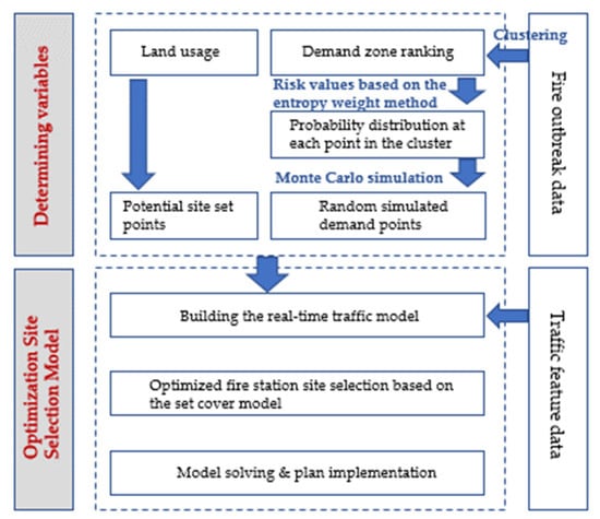 This study targets the urban area of Nanjing City and builds the spatiotemporal dataset of multi-source data, including the fire history from June 2014 to June 2018 as well as the real-time traffic data and traffic network data via the Amap OPEN API. Moreover, this study investigates the regularity behind fire outbreaks and identifies and selectively incorporates the risk factors into the fire risk evaluation system. Based on the entropy weight method, the risk factors of the different fire types are normalized and the weight of each factor is obtained. After meshing the urban area of Nanjing, the fire risk value distribution across the grid cells is identified via superposition. Meanwhile, the fire data of Nanjing in 2014–2018 are put through the clustering analysis, and the probability distribution at each point of the cluster is calculated using the average score. The Monte Carlo simulation is performed to map the random fire outbreak points, and then these massive randomly distributed simulated fire outbreak points are inputted into the actual traffic network model, which is finally transferred into the location set cover model constrained by the land use plan to solve the site selection problem (Figure 1). The presented method overcomes the difficulty in mapping the fires caused by the complex fire distribution and meanwhile eliminates the error induced by the idealization of the traffic situation. It is worth noting that this research project is granted by the Nanjing Fire Department and the Nanjing Bureau of Planning and Natural Resources. The research findings provide important guidance on the actual site selection of fire stations of Nanjing, and the presented method, a novel method for urban fire station site selection in the big data era, is practical to provide references for analogous specialized planning of other cities. Fire station site selection based on fire risk evaluation can greatly improve the effectiveness and service rate of fire stations.