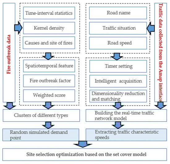 To conclude, much progress has been made in addressing the fire station site selection issue based on models that consider temporal–spatial demands. However, there are two prominent shortcomings in these models. (1) The randomness of the spatial demand distribution is not sufficiently discussed. For random events, such as a fire, the existing site selection model mainly uses fire-related factors to divide the risk level. However, this is only an analysis of historical data, and the obtained site selection plan cannot be ensured to be valid during the whole planning period. Although certain efforts have been made to incorporate the spatial randomness factor into the site selection model, there is still a lack of a random simulation method for spatial demands. Specifically, such a method is expected to not only accurately describe the demand distribution but also effectively optimize the model based on the description. In this context, the site selection issue can be better solved. (2) Existing site selection models generally lack consideration of travel time and distance. Some studies have demonstrated the impact of traffic conditions on the accessibility of emergency stations by obtaining traffic data through APIs, and they have also have tried to include short-term data into the models. However, there are still no sufficiently efficient site selection methods that can stream long-term data and include traffic factors quantitatively into the model.