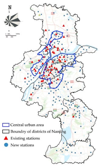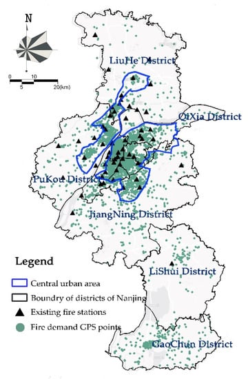 Nanjing, the capital city of Jiangsu Province, has an urban area of 1364.85 km2. By 2020, there are a total of 57 fire stations that have been built and put into service in Nanjing (including 2 special-duty fire stations, 54 normal fire stations, and 1 firefighting support fire station). A total of 39 stations are located in the urban area, while 18 lie in the suburban area. There are no underground fire stations. The current distribution of the effectively-operated fire stations is generally characterized by the high density in the central urban area and low density in the developing urban fringe area. Xuanwu, Gulou, Qinhuai, Yuhuatai, Jianye, Qixia, and Pukou districts are found with more existing fire stations (points), correspondingly associated with relatively concentrated distributions (Figure 3). The Standard for Urban Fire Station Construction (MOHURD Standard 152-2017, a national sector standard of China) stipulates that the service area of the normal fire station in cities should be no larger than 7 km2, and that of the normal fire station in suburbs should be no larger than 15 km2, which means there should be at least 114 fire stations in Nanjing. The quantity of the existing fire stations is far less than the stipulated one. The service area of the fire stations is, in most cases, overwhelmingly large, and the five-minute arrival required by the standard cannot be realized (at present, the average travel time to the fire site is about 11.6 min). The service area of an individual fire station far exceeds the upper limit of the service area. Moreover, the traffic jam of the city is intensified over recent years. Thus, the optimal response time for rescue and disaster relief cannot be guaranteed. It should also be noted that the land that can be used to build fire stations is in short in the city, which leads to the uneven distribution of fire stations and considerable firefighting dead zone. For example, the South New Town centered at the Nanjing South Railway Station and the Maqun area in the eastern Purple Mountain are found with no placement of fire stations.
