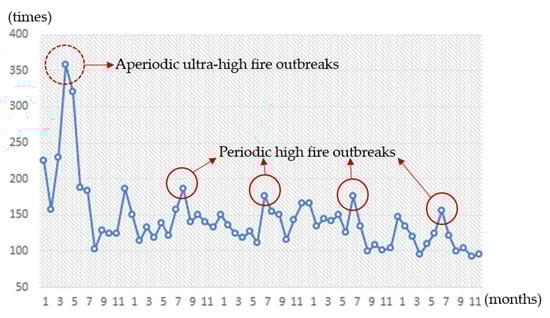 From a temporal point of view, the fire outbreaks are obviously periodic. Regarding months, July and August are associated with periodic high fire outbreaks, resulting in nearly 200 fire events over the last three years. However, July–August in 2014 presents itself as a rare valley of fire outbreaks, which is attributed to the fire security circles (for fire prevention and facility protection) set up by the Nanjing Municipal Government for the Youth Olympic Games held at that time in Nanjing. Besides, January and February in winter are the secondary periodic peak for fire outbreaks. April in 2014 is seen with aperiodic ultra-high fire outbreaks (360 outbreaks).