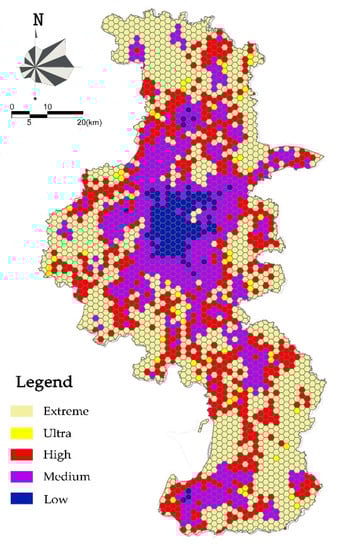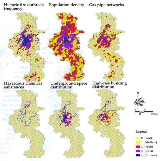 The fire risk evaluation of the urban area involves various aspects, such as the occurrences, development, control, and firefighting and rescue in the urban area, and is characterized by numerous and complex influential factors. The fire risk evaluation calculates the fire outbreak probability, predicts the disaster consequence, and quantifies the fire risk, by analyzing the factors affecting fires. It can provide scientific references for developing the urban firefighting plan and direct the urban fire safety management to improve the resistance of cities to fire disasters. By far, the previous urban fire risk evaluation cases in China and other countries mostly focus on the evaluation index system establishment, the evaluation model and its application, etc. The risk ranking of the U.S. considers risk factors such as the application scenario of architectures, building density, and fire separation, while the “urban ranking system” of Japan mainly considers the type and structure condition of buildings, climate condition, and firefighting system [,]. Ding and Wang [] choose the population, firefighting infrastructure, firefighting capacity, public security condition, and major hazardous source as the five primary factors. Zhang [] further refines the risk factors into the firefighting key area, population density, high-rise building distribution, large crowded underground space, and firefighting taskforce to build the fire risk evaluation framework, from the perspective of the urban space, and identifies the high, medium, and low-risk areas. In general, when it comes to building the evaluation system, previous studies often focus on investigating and refining the fire hazardous source, firefighting capacity development, firefighting management status, and regional disaster-resistant capacity. The relevant studies are increasingly mature, and yet with the ever-complicated development of large cities, the urban fire risk evaluation shall highlight the spatial analysis of each underlying factor, quantify the risk fire evaluation into the material space, and precisely rank the underlying fire risks of each urban land blocks, in order to realize refined management of the urban firefighting security. Hence, based on the previous studies, the features of this research, and the characteristics of the fire outbreaks in Nanjing, the population density, high-rise building distribution, underground space distribution, site distributions of gas facilities, and hazardous chemical substances, and historic fire outbreak frequency are determined as the six major underlying factors for evaluation. The weight and score of each factor and the comprehensive score distribution across the urban area are calculated using the entropy weight method (Table 2, Figure 6 and Figure 7). This research simulates the underlying fire outbreaks and assumes that the firefighting capacity is limited to putting out fires and rescue. Thus, the firefighting capacity is not included as an evaluation factor.