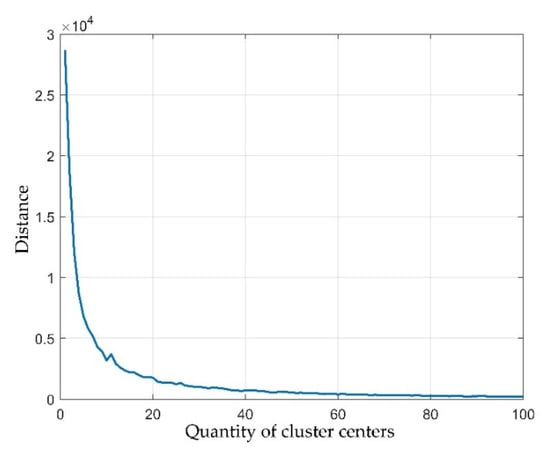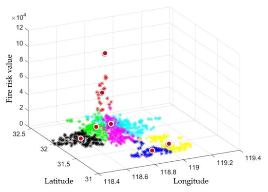 The three-dimensional K-means clustering analysis is carried out for the demand spatiotemporal points of fire outbreaks from 2014–2018, and the cluster quantity is K. The average horizontal and vertical coordinates μ of the relative cluster center for points of each cluster are calculated, which is combined with the fire risk value of the corresponding grid cell to form the 3D coordinates for clustering analysis. The clustering adopts the mean-variance normalization, and the clustering and Gaussian distribution fitting results of the data of 2014–2018 are used. It shall be noted that the K-means clustering requires determining the cluster quantity K, which is set as seven in this research. The main clustering process has three steps: first, K random starting points are chosen as the mass centers; second, the data in the dataset are assigned to each cluster according to the distance to the mass centers, and the averages of each cluster are calculated and set as the new mass centers; and third, the second step is repeated until there is no change for all clusters (Figure 8, Figure 9 and Figure 10). According to the elbow method, K = 7 brings about the best classification performance for spatiotemporal features, which means no concealing features and in the meanwhile clear grouping. The data clustering and Gaussian fitting results are used for the Monte Carlo simulation to generate several random demand (fire outbreak) points.