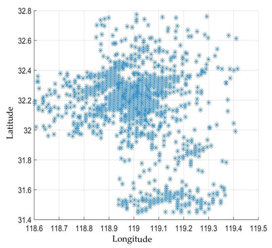 The objective function Equation (5) requires a minimal quantity of the constructed service station. The objective function Equation (6) is a global constraint requiring that, for any simulated demand point, the ideal travel time () from the corresponding fire station to its service zone shall be lower than a specified time (), according to the traffic network model T considering the traffic jam. Calculating the actual travel time from the fire station j to the random simulated point i in the demand zone needs to determine the corresponding distance and travel speed. Here, we first change the random demand point generated in Step 3.1 with the potential and existing fire station, convert their coordinates into a unified system, and export them into the spatiotemporal dataset. Subsequently, the single-source shortest path between two points in the weighted graph (namely the traffic network model T) is calculated using the path solver based on the Dijkstra algorithm, which is divided by the traffic characteristic speed of the corresponding road to yield the travel time. The travel time results are converted into the time matrix . This constraint requires the response probability above 90% over the service range (considering errors, α is artificially set as 90%). This paper takes Nanjing city as an example, and accurately dissects the spatiotemporal characteristic of firefighting events, based on the actual demand points of firefighting events and the traffic network data. Thus, we manage to perform more precise measurements of each variable in the equations and develop a more reasonable site selection plan. The next chapter introduces the fire data of Nanjing and the data sources.