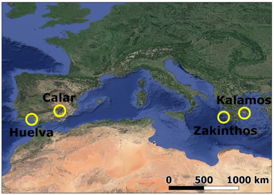 As case study, for applying the BA mapping algorithm from Sentinel-2 (S2) satellite images, we selected four sites in southern Europe where large fires occurred in 2017, a severe fire year for the European continent, due to abnormal droughts and heat waves []. Extreme weather conditions led to large fires affecting, in particular, Portugal, Spain, southern France, Greece and Italy []. In particular, we selected sites in Spain and Greece as shown in Figure 1. The geospatial dataset is composed of (i) S2 images, (ii) active fire points and (iii) reference burned area perimeters.