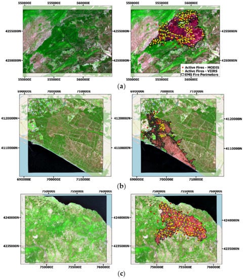 Active fires (AFs) were downloaded from the Fire Information for Resource Management System (FIRMS, https://earthdata.nasa.gov/earth-observation-data/near-real-time/firms, last access 1 July 2021) and used as training data. FIRMS distributes Near Real-Time (NRT) and archived active fire data from the NASA’s Moderate Resolution Imaging Spectroradiometer (MODIS), aboard the Terra and Aqua satellites [], and NASA’s Visible Infrared Imaging Radiometer Suite (VIIRS), aboard the joint NASA/NOAA Suomi National Polar orbiting Partnership (Suomi NPP) []. Both MODIS and VIIRS fire datasets are accompanied by a layer of detection confidence of each individual fire, ranging in 0-100%. MODIS and VIIRS products were subset to extract fires detected between the S2 pre-fire and post-fire dates for each study site (Figure 2).