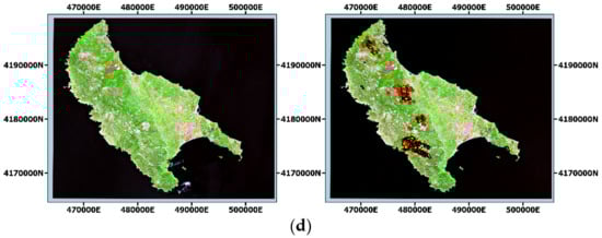 Over each site, a pair of clear-sky S2 images were selected before (pre-fire date) and after (post-fire date) major fire events (Figure 2, Table 2). The sooner the image is acquired after the fire event the easier is the detection due to a stronger spectral signature of burn, as a consequence of fire on vegetation compound. For this reason, in general, we select the first available clear image after the event []. In this study, the temporal difference between pre- and post-fire images is on average 20 days.