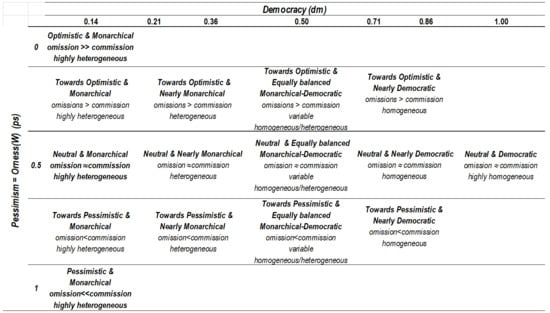 In order to make it easier to understand the semantics of the OWA operators once we computed the pair (ps, dm), in Figure 3, we provide linguistic expressions that allow humans to interpret the correspondent attitudes of the OWA operators to generate more omissions/commissions errors in heterogeneous/homogenous areas. In the bi-dimensional space of pessimism (ps, rows) and democracy (dm, columns) distinct quadrants correspond to given attitudes.