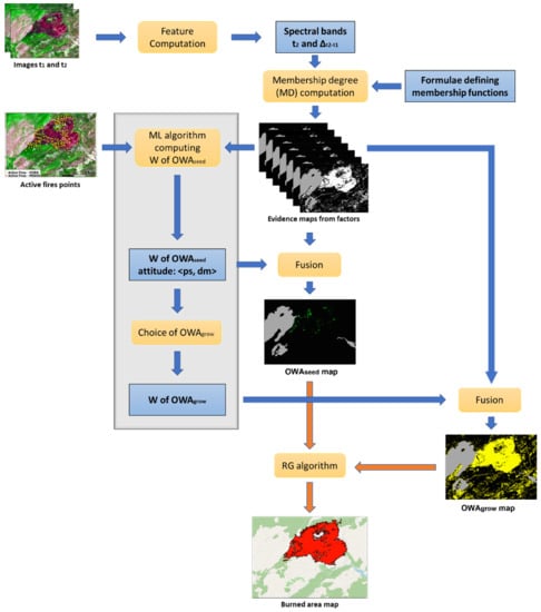 The MDs values are aggregated by means of a fusion function defined as an OWA operator to provide a synthetic score of global evidence of burn, as brought by redundant/complementary inputs. OWAs can model different attitudes/semantics. Global evidence of burned areas obtained with different OWAs (e.g., ranging from extreme conditions of minimum and maximum operators) is used as seed (OWAseed) and a grow (OWAgrow) layers by the Region Growing (RG) algorithm that exploits spatial connectivity of burned pixels. Here, we present a new formalization of the BA algorithm where the input to the RG algorithm can be automatically generated from training AF points.