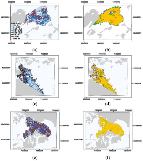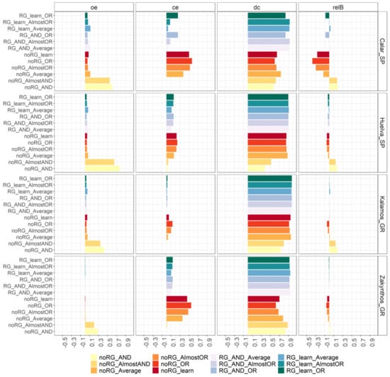 After the selection of the most appropriate OWAgrow, the region growing (RG) algorithm is run in Harris IDL language (https://www.l3harrisgeospatial.com/docs/region_grow.html, last access 1 July 2021). Region growing is a procedure that groups pixels or sub regions into larger regions based on pre-defined criteria []. The RG algorithm is an iterative algorithm that starting from initial seeds extracted from the OWAseed layer (OWAlearn, in this case), it searches the eight-neighbor connected pixels and it includes in the new seed layer for the next iteration only those pixels that satisfy the constraint OWAgrow > 0. Initial seeds are pixels with OWAlearn > 0.9. The output is a raster map with pixel value, RGscore, in [0, 1].