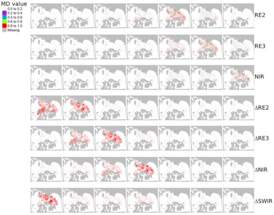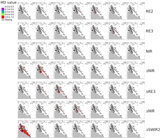 in which gi is the i-th largest value of the d1, …, dN. In this case study, are the MDs of the seven input factors (N = 7): RE2, RE3, NIR, ΔRE2, ΔRE3, ΔNIR, ΔSWIR2.