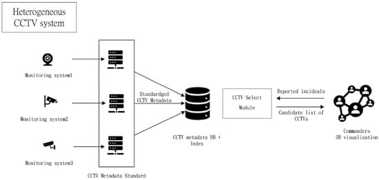The standardised metadata proposed in this study intends to enable the emergency response commanders to quickly locate all the available CCTVs and determine their fitness of use upon reported disaster incidents. The sharing mechanism must allow to search and interpret the CCTV information across different platforms in an interoperable way and ensure all of the CCTVs are searched and checked. Even CCTV systems that are not catalogued beforehand can be readily added to the sharing mechanism as long as their metadata follows the suggested metadata schema. By effectively integrating heterogeneous CCTV systems, this mechanism enables to flexibly expand its service capabilities whenever necessary, and the usage of individual CCTV service is hence beyond its original purpose, i.e., CCTV systems previously deployed for criminal protection or traffic monitoring can be used for disaster validation as well.