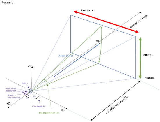 Based on the hardware specification, every CCTV has a specific FOV that limits its maximum visual coverage. A CCTV camera uses a lens sensor to record images or videos of objects in reality. Since the content recorded in image and video format is generally square, the geometric characteristics of FOV can be first modelled as a three-dimensional volume object with four corners, similar to a pyramid. The geometry of this pyramid is mainly determined by the format of the sensor, the focal length of the lens and the angle of view (Figure 3). Parameters that may affect the FOV include: