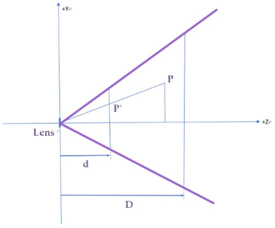 - Sensor: The parameters for the image sensor format include the height (denoted by h) and the width (denoted by w) for defining the size of the sensor. For example, the diagonal length of Sony IMX482LQJ (https://www.sony-semicon.co.jp/products/common/pdf/IMX482LQJ_Flyer.pdf, accessed on 12 July 2021) is 12.86 mm (type 1/2”), and the aspect ratio is 16:9, so the parameters of w and h can be determined accordingly.