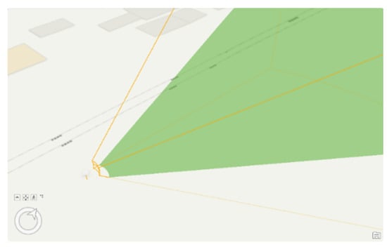 To aid the selection of CCTVs across heterogeneous systems, an essential requirement is that every CCTV camera must provide its location and FOV information in a standard way. The simplest way of showing the geographic distribution of CCTVs is to represent CCTV as a point symbol on the 2D reference maps. However, this presentation lacks information about the area covered by the CCTVs, so it can be used only for excluding CCTVs, not in the neighbouring area of the reported incidents. An improved approach is to add a circular sector that emulates the FOV of individual CCTV. Although this approach can help to remove the CCTVs not pointing to the location of the reported incidents, the 2D map (Figure 2) overlay can merely illustrate the locational relationship between the hypothesised 2D FOV of CCTVs and neighbouring objects without considering many factors that may affect the visibility, e.g., the “deployed height”, “pitch angle” and “obstruction of objects”. All three factors are important in determining if the objects of interest can be seen [].