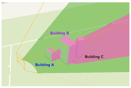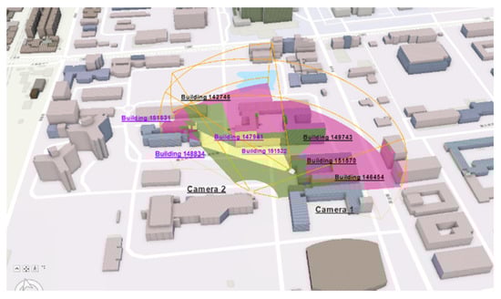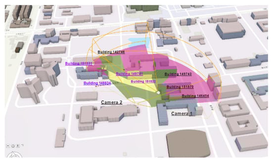 Another test takes the Building 149741 as the constraint; the search results on the index Table 5 (based on the visible objects in metadata), find two CCTVs can provide visual information about Building 147941 (Table 6). Figure 16 and Figure 17a,b, respectively, show the 3D FOV analysis and the two images captured by the two cameras. Although building 149741 is recorded as visible by both CCTVs, the 3D FOV analysis shows only parts of the building are visible due to the obstruction. With these two CCTV selected, the index also shows parts of building ID 151531 are also visible from both CCTVs. This test clearly demonstrates the advantage of managing multiple CCTV systems through standardised metadata and the potential to provide better visual coverage than what a single CCTV system alone can provide. The above 3D illustration shows the area of invisible, visible and multi-coverage with the colours of red, green and yellow. The multiple coverage areas, as Section 2.3 suggests, can be explicitly recorded. Thus, as long as the reported incident is within it, the information of this set of CCTVs can be retrieved directly from the database.