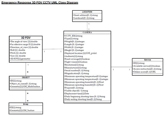 The above 5W1H perspectives are used to analyse the required metadata elements that can provide descriptive information for available CCTV systems, such that commanders can take advantage of all the available CCTV services, regardless of their heterogeneity, for making prompt emergency response decisions. An effective sharing mechanism would require the stakeholders of all the CCTV systems to establish standardised metadata beforehand so that the metadata-based mechanism is ready for CCTV querying when emergency situations occur. Commanders can specify various types of constraints on the metadata, including 3D FOV analysis, to discover the candidate set of CCTVs for their decision reference. Whether the CCTV streaming service is available to the commanders, however, still depends on if the collaboration relationship between the EOC and authorised stakeholders of the CCTV systems can be established. Based on the analysed results, Figure 9 illustrates the UML schema of the proposed metadata.