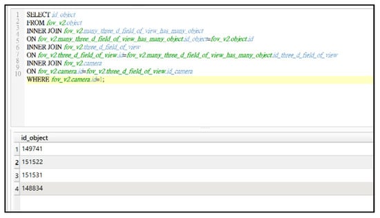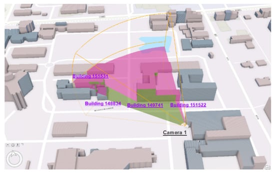 Scenario 1 is designed to test the creation and use of the 3D FOV information of a single CCTV. Every CCTV is required to establish its metadata according to the schema proposed in Section 3. The visibility information for each CCTV is determined by the locational relationships between the 3D FOV of the CCTVs and the 3D buildings. Figure 11 shows the visibility analysis results of Camera 1. The region marked by the colour green and red, respectively, depict the area visible and invisible from Camera 1. With the 3D perspective added, it clearly shows that some of the areas are obstructed by the buildings, and the FOV is no longer a sector-based area, as shown in Figure 10. This implies the ignorance of existing objects in reality (e.g., buildings) may give the commanders a false interpretation regarding the choice of CCTVs, and the 2D FOV approach is not sufficient. Figure 12 shows the actual image obtained. An obvious and additional advantage of introducing 3D FOV is the visible information is not restricted to the ground only. The visible information now extends to the vertical dimension, such that whether a particular building or wall is visible or not can also be determined and recorded in the metadata. When working in a 3D GIS environment, the commander can freely rotate or enlarge the 3D scene to gain a better understanding of the 3D FOV and the area covered by the available CCTVs. The direct visual illustration provides an improved interface for inspecting the 3D FOV of CCTV and enables the choice of the best CCTV for the task at hand. Following the proposed UML, the visible relationship between the CCTV and buildings can be further recorded on the basis of their IDs. In this case, the index explicitly records the visible relationship between Camera 1 and Building ID 149741, 151522, 151531, 148834. This implies the commander has the flexibility to query the visible buildings of a single CCTV by specifying its ID (Figure 13) and obtain the information of all objects it can observe. If the 3D information of the CCTV FOV or the buildings change, the visible relationship has to be reanalysed and updated in the metadata and index.