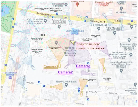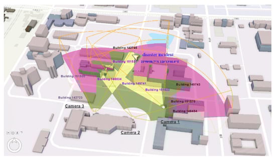 Scenario 2 demonstrates the search for candidate CCTVs from a specified location or the objects in reality. When the location of a disaster incident (22°59’58.7” N 120°13’00.9” E) is reported, the selection of CCTV starts at filtering candidate CCTVs by testing the “within” relationship between the reported location and the 2D FOV of the CCTVs. In this case, 17 CCTVs are removed, and only 3 CCTVs remain on the candidate list (Figure 14). Further 3D FOV analysis in the refinement step shows only CCTV 2 and 3 can provide visual inspection; CCTV 1 is excluded due to obstruction of the building (Figure 15).