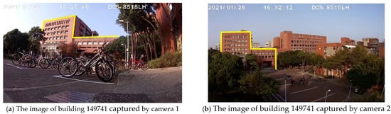 The specified building and the images respectively captured by the two cameras (a) Camera1 (b) Camera2.