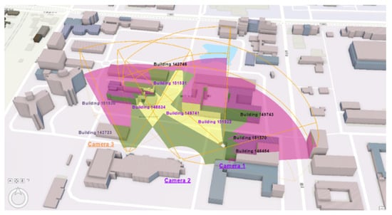 Since some types of CCTVs may not work at night, Scenario 3 is designed to demonstrate the different visual coverage during daytime and nighttime. When the analysed scenarios are at night, CCTVs incapable of providing direct visual inspection can be easily excluded by specifying constraints on the metadata element of night vision. Camera 3 in this scenario is a CCTV that only operates in the daytime. While in the daytime, the yellow region in Figure 18 depicts the area that can be simultaneously observed from all three CCTVs. After Camera 3 is removed at night, the monitored area appears to be reduced (Figure 19). In this scenario, buildings 142723 and 151530 can be monitored in the daytime but are not visible at night. With the introduction of standardised metadata, commanders are provided with correct visible information if the night vision metadata of all CCTV systems are created accordingly. The system can therefore adapt to the time-dependent characteristics of CCTV systems, and most importantly, the commanders are prompted with the “correct” CCTV visual coverage all the time. This process can also be used for a situation like CCTV out of service, not available, only authorised to certain circumstances, etc.