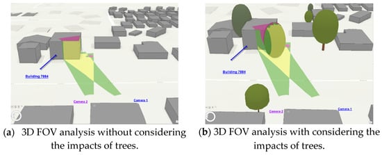 The outcomes of the proposed approach heavily rely on the analysis of the visibility relationship between the 3D FOV and 3D city model data. While the 3D FOV information often remains unchanged, the phenomena available from the 3D city model data become an important factor for the visibility outcomes. The more detailed information we introduce to the analysis, the more accurate information we can get for the visibility outcomes. Among the various types of phenomena in the urban environment, the impacts caused by trees must be considered. Urban afforestation provides its citizens with a healthy and comfortable living environment, but on the other hand, it may also tremendously obstruct the viewable objects of the CCTVs. Especially for boulevards, the visual coverage may be substantially reduced after trees are considered. Figure 21a,b, respectively, show the 3D FOV analysis with and without considering the impacts of trees. In Figure 21a, the wall of building 7884 is visible, but only about half of it is visible from both CCTVs. The selection of both cameras appears to be a reasonable choice. However, after trees are considered, not only the multiple coverages on the wall of building 7884 almost drops to 0, the visible part also significantly reduces, not to mention there is only one CCTV that can provide visual aids now. Under such circumstances, the two CCTVs are no longer a good choice. By additionally considering other types of objects, the visibility of an object and its composing surface may deteriorate from visible to invisible, or multiple coverages become single coverage or even invisible. Based on the proposed 3D FOV analysis, this can all be evaluated and recorded in a quantitative way. Since the materials of the majority of objects, in reality, are non-transparent, they are surely visual obstacles that may cause all kinds of obstruction. This also proves the importance of the content of the 3D city database to the proposed mechanism.