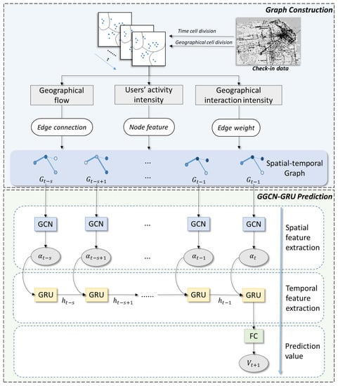 To address the aforementioned problems, we propose the geographical interactions weighted graph convolutional network-gated recurrent unit (GGCN-GRU) model, which comprises deep learning methods on graphs to dynamically predict user activity intensity. Owing to the large amount of social media data, with more detailed personal trajectory and attribute information, which can better reflect the purpose of people’s movement, we used social media check-in data to test the effectiveness of the model. The main contributions of this paper are as follows: