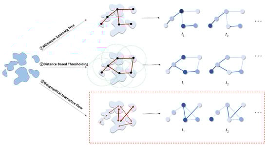 Graph construction methods considered in this study were minimum spanning tree (MST), distance-based thresholding (DBT), and geographical interactions (GIF). MST keeps all nodes connected while minimizing the number of connected edges. DBT connects nodes according to distance; the connected edges are different with the size of the distance threshold. GIF, which uses the geographical interaction flows of historical user movement records, is the method used in this study.